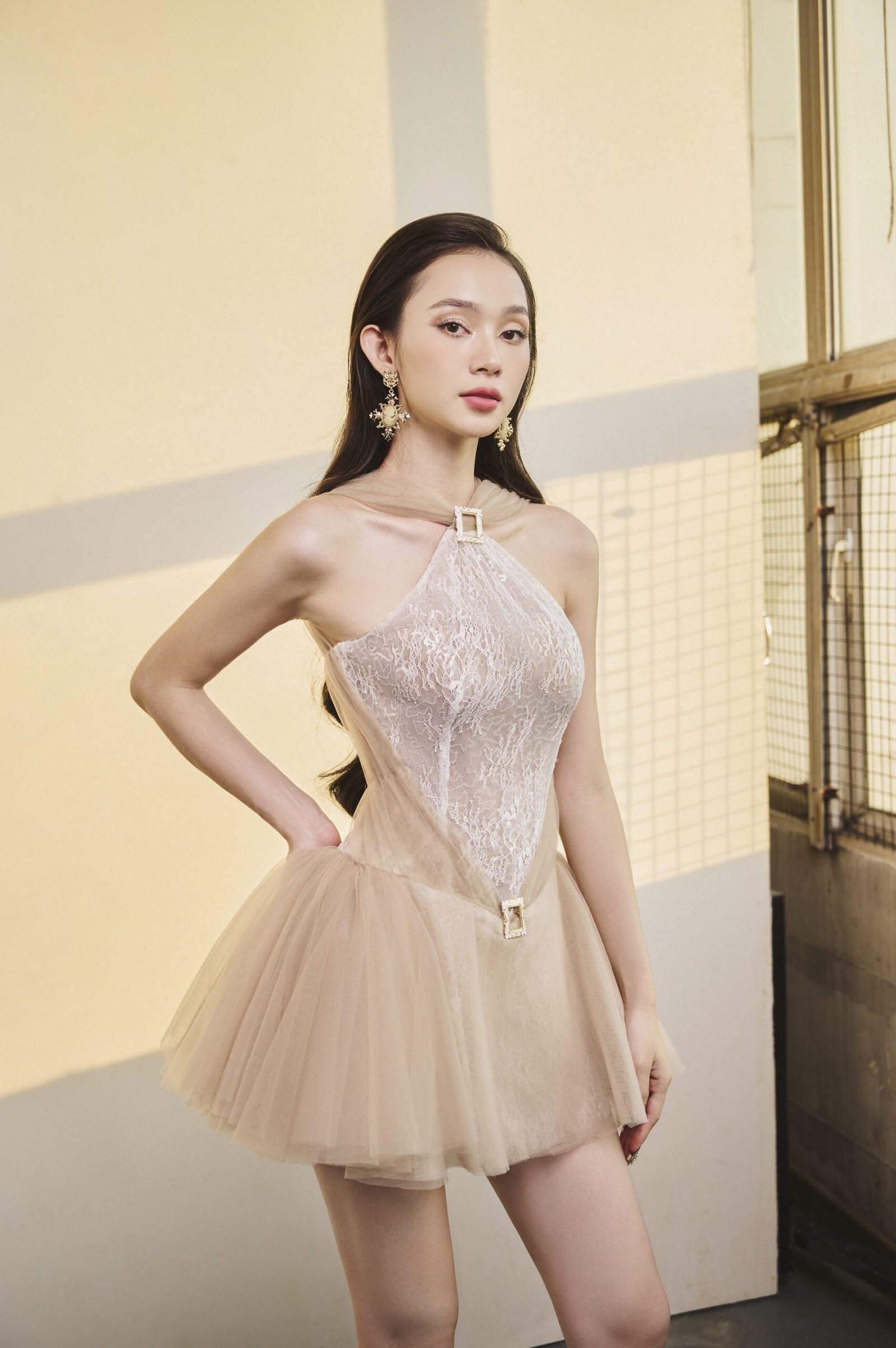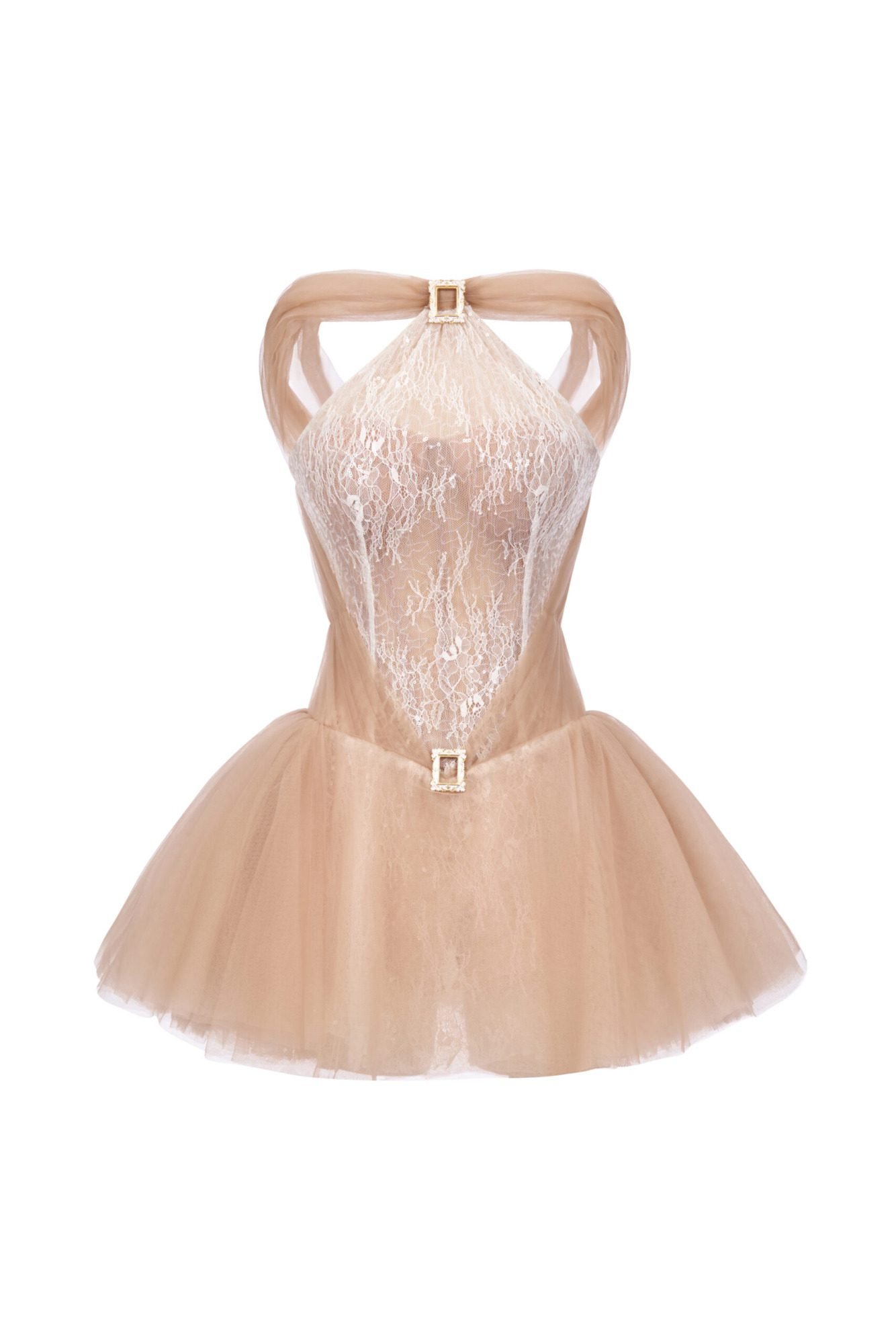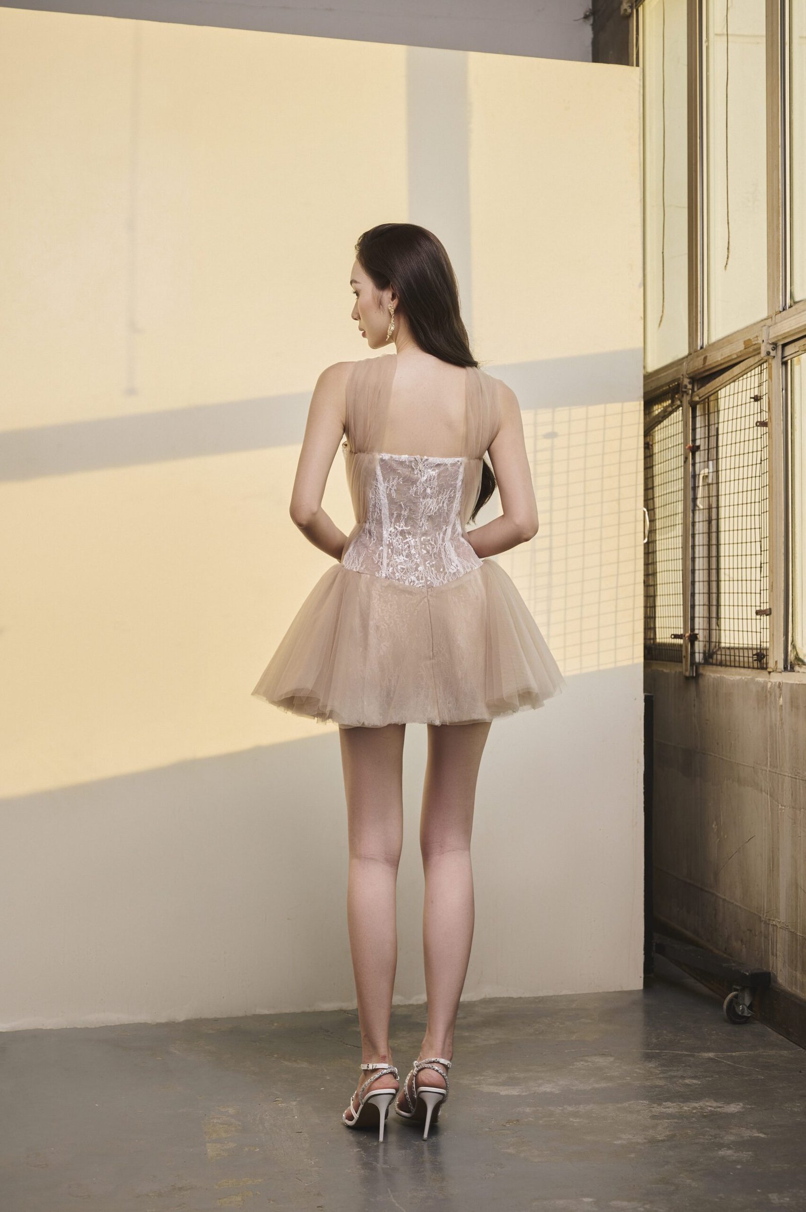 The Aline Dress captures the playful elegance of a princess while maintaining a sophisticated allure. Featuring a daring neckline and a short, figure-flattering skirt, this dress combines a rich brown with delicate white floral patterns. Crafted from soft mesh, glitter mesh, and hard mesh, it seamlessly blends fun and refinement.