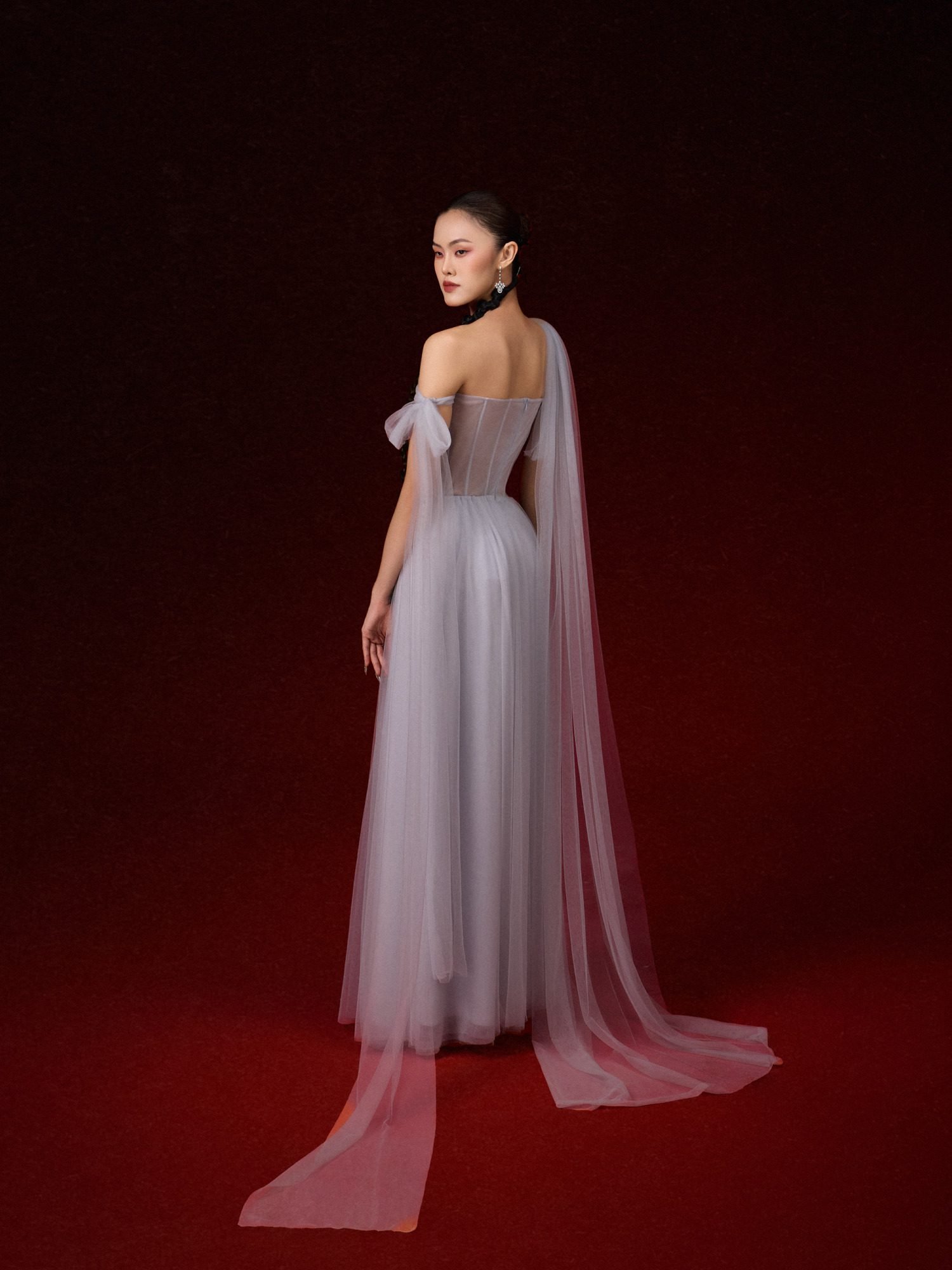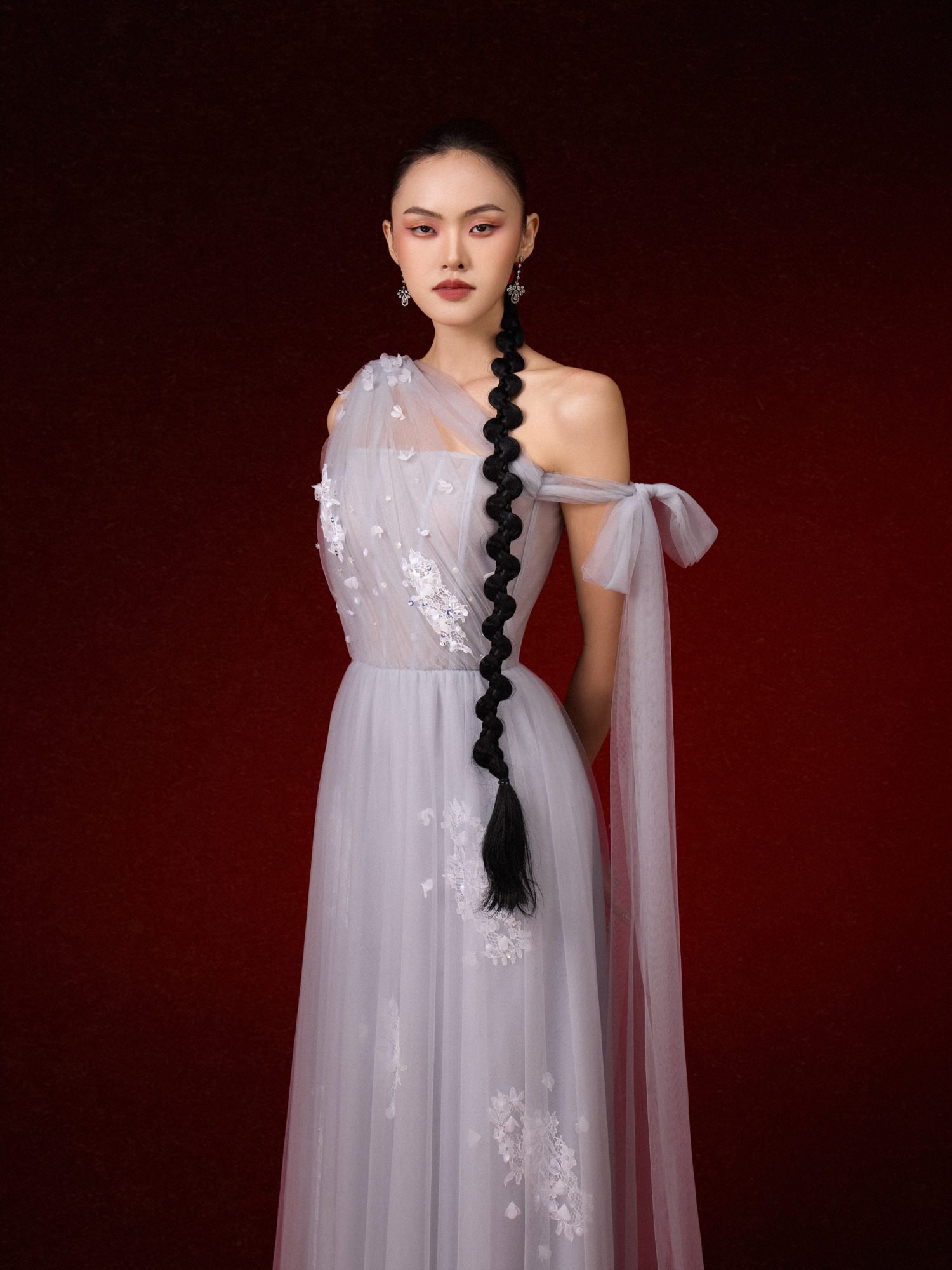Enchanting gown is a perfect blend of delicate sophistication and modern charm. The soft, ethereal tulle fabric drapes beautifully, creating a flowing silhouette that exudes grace with every movement. The one-shoulder design, with its elegant tie detail, adds an element of refinement and modernity. Intricate floral embroidery, scattered across the bodice and skirt, enhances the dress’s ethereal quality, imbuing it with a sense of romanticism.