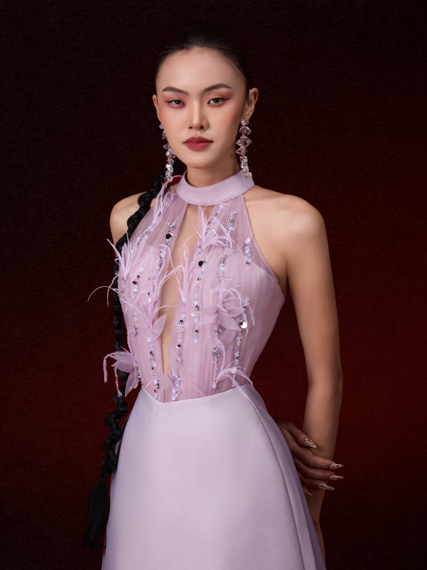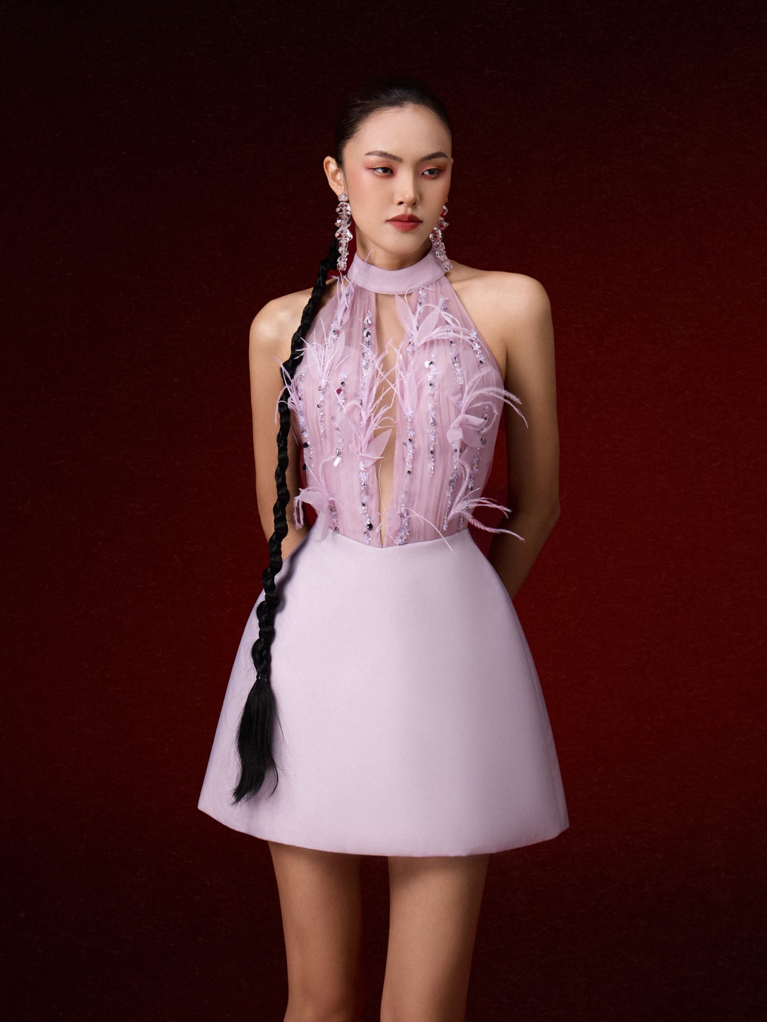 Playful yet sophisticated BONNIE DRESS is a striking blend of modern style and delicate detail. The soft lilac hue exudes a fresh, youthful elegance, while the intricately embellished bodice, adorned with sparkling sequins and delicate feather-like embellishments, adds a touch of opulence. The high neckline creates a chic, structured silhouette, contrasting beautifully with the flowing skirt that offers a playful, voluminous shape.