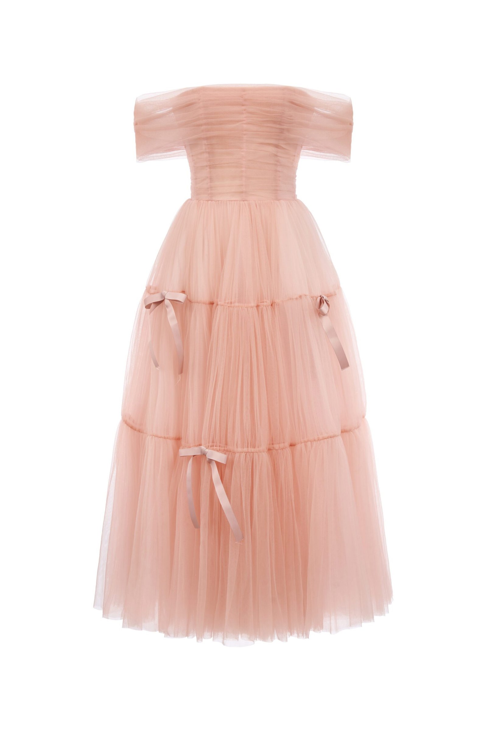 The Bowtie Dress exudes a delightful charm while maintaining an air of sophistication. The trendsetting bowtie detail serves as a captivating accent, drawing attention to the corset form and the elegant flared silhouette. This stunning dress in a soft pink hue is crafted from luxurious mesh fabric, perfectly balancing playful elegance with refined style.