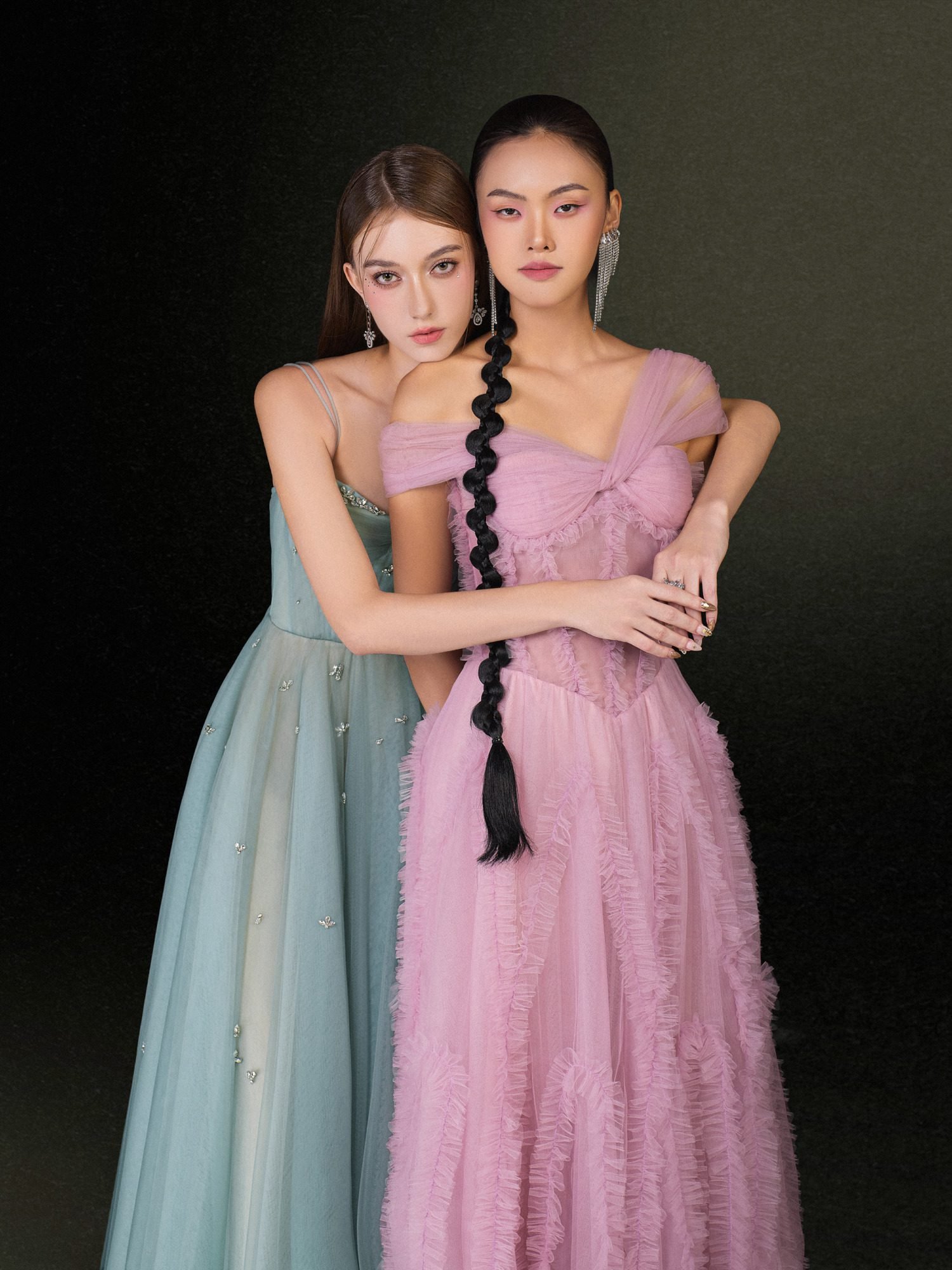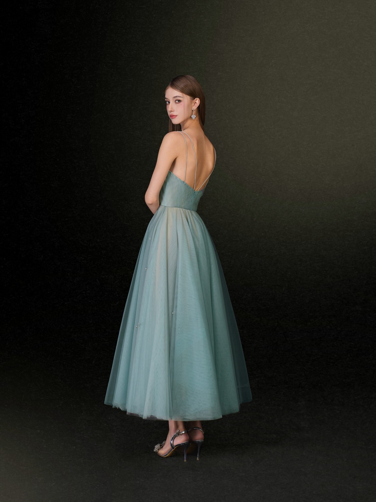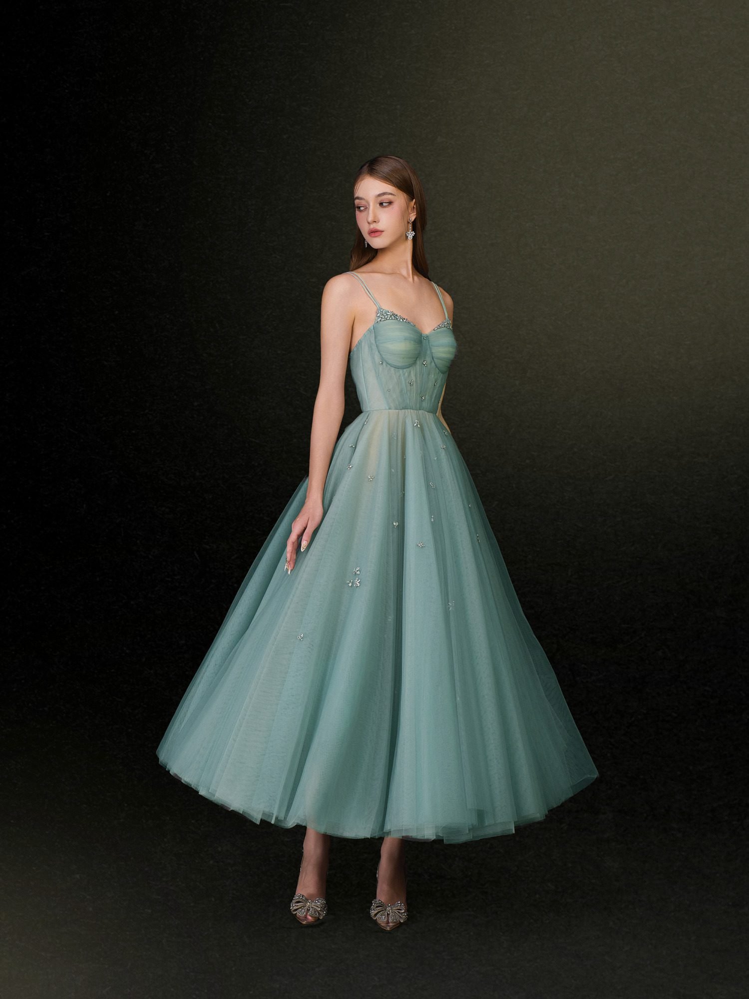 This exquisite gown embodies a soft, ethereal beauty with its delicate mint green tulle fabric. The sweetheart neckline enhances the feminine silhouette, while the thin straps add a delicate, refined touch. The flowing skirt cascades gracefully to the floor, creating an enchanting and dreamlike effect.