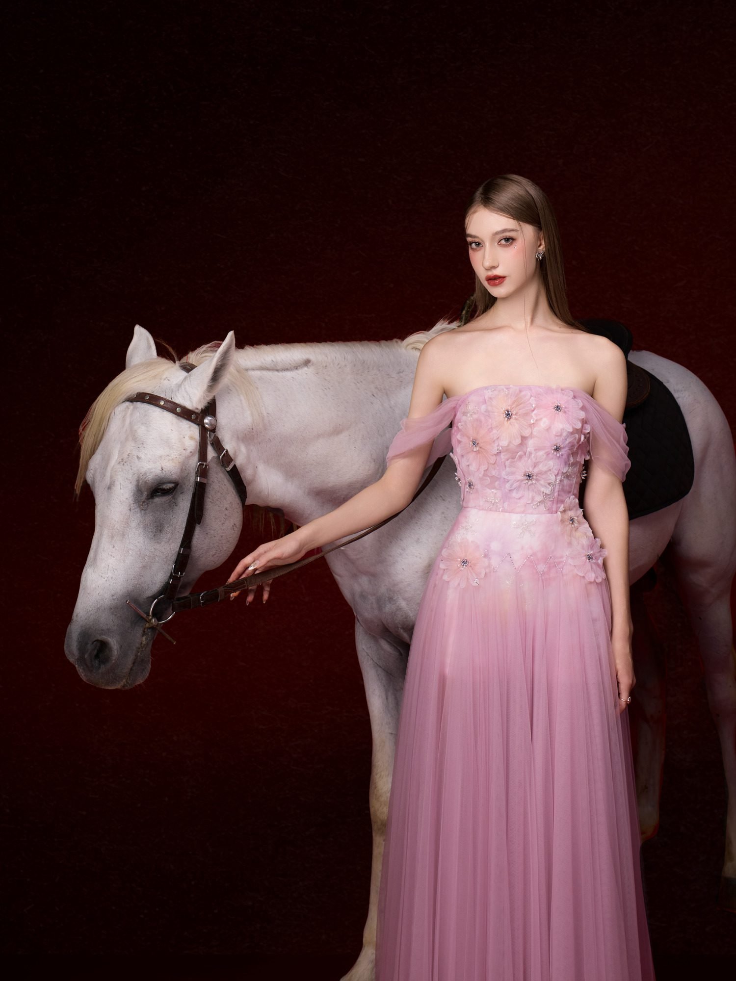 This enchanting gown radiates a soft, romantic charm, designed to evoke the beauty of nature. The dress features a strapless bodice adorned with intricate floral embellishments that bloom delicately across the fabric. These flowers, crafted with soft petals and sparkling details, add a magical touch to the gown, further enhanced by the airy tulle fabric that gently flows to the floor.