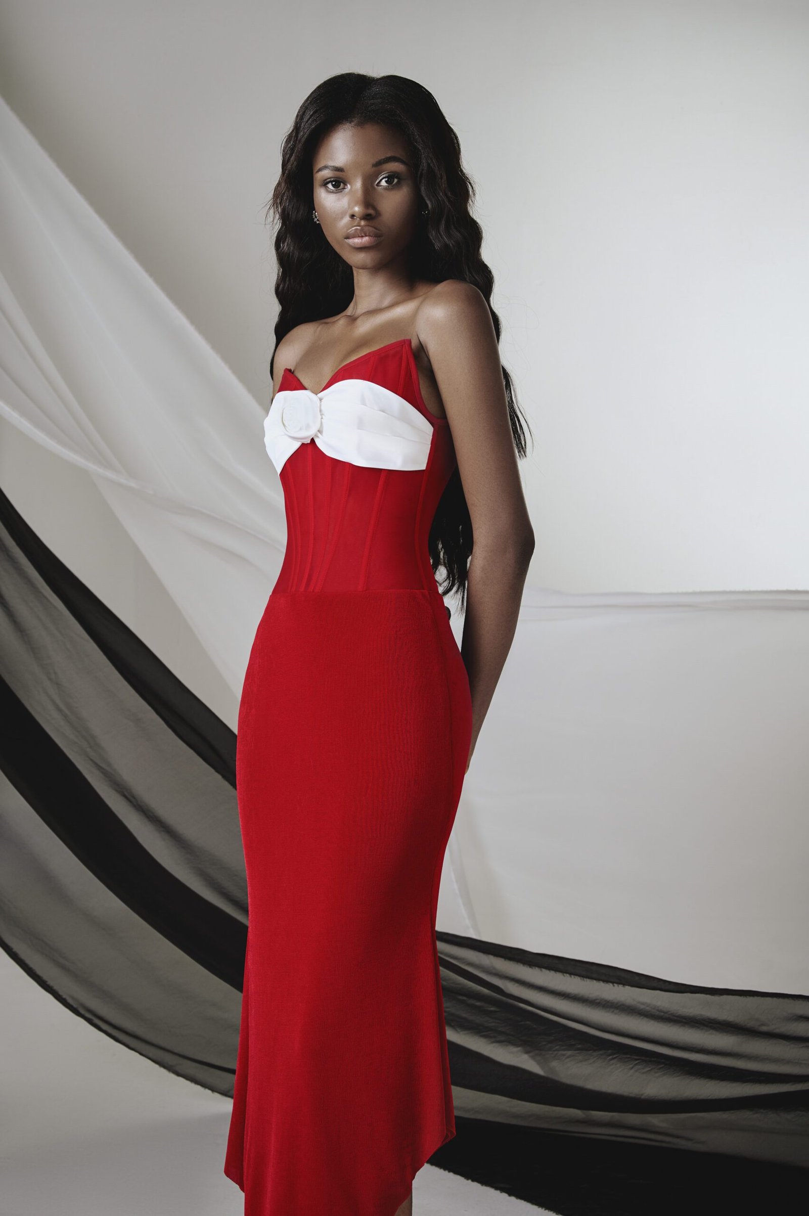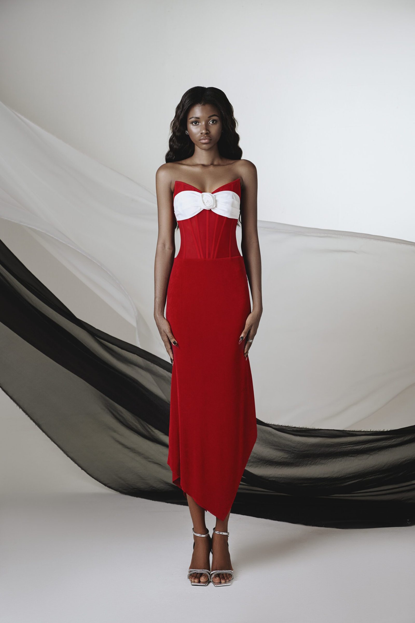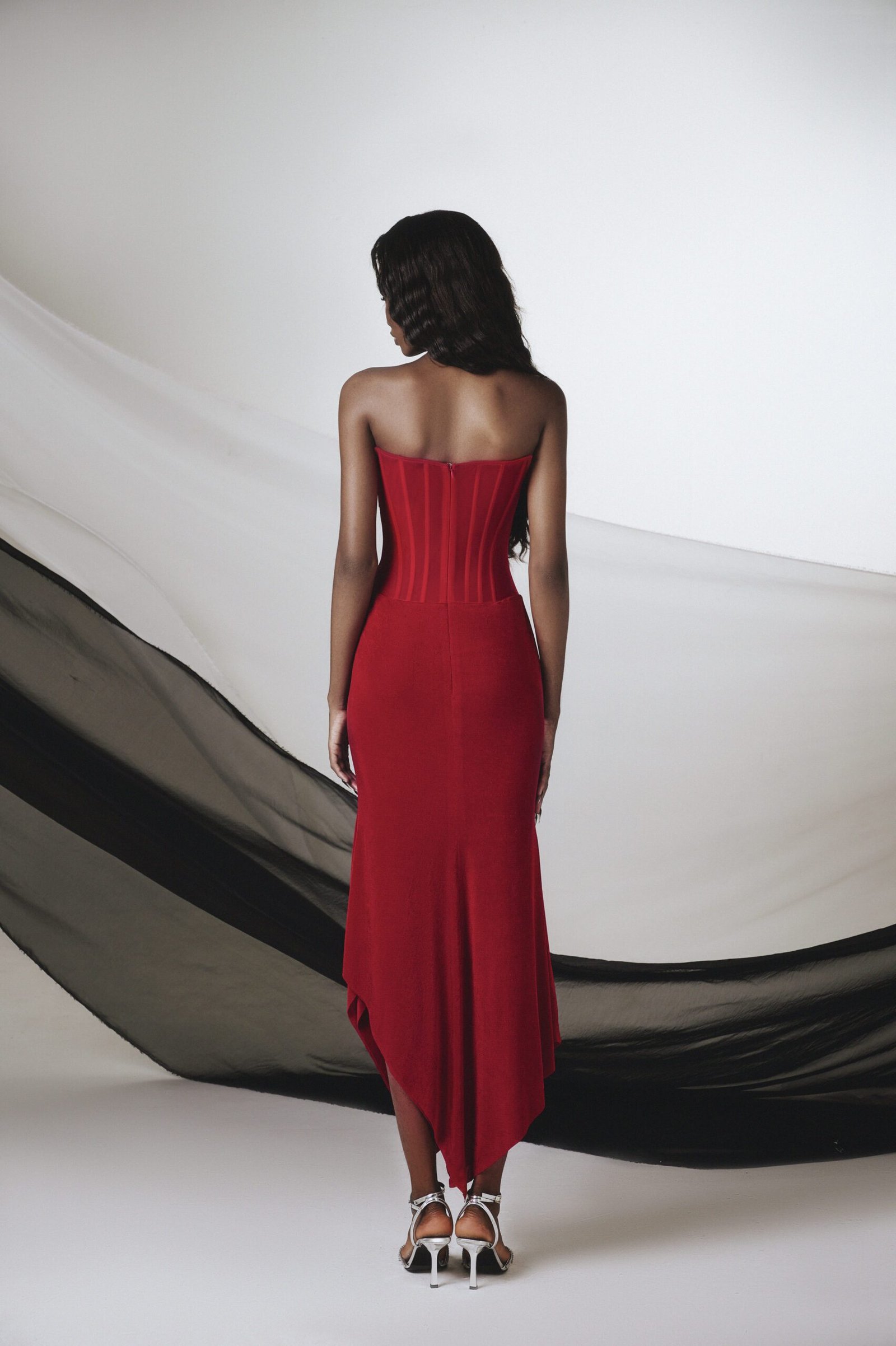 The Hana Dress embodies exceptional allure. It accentuates the figure with its sweetheart neckline and corset form. Available in two color versions: red and black. The dress combines multiple materials: Soft Mesh, Taffeta, Spandex, and Silk Lining.