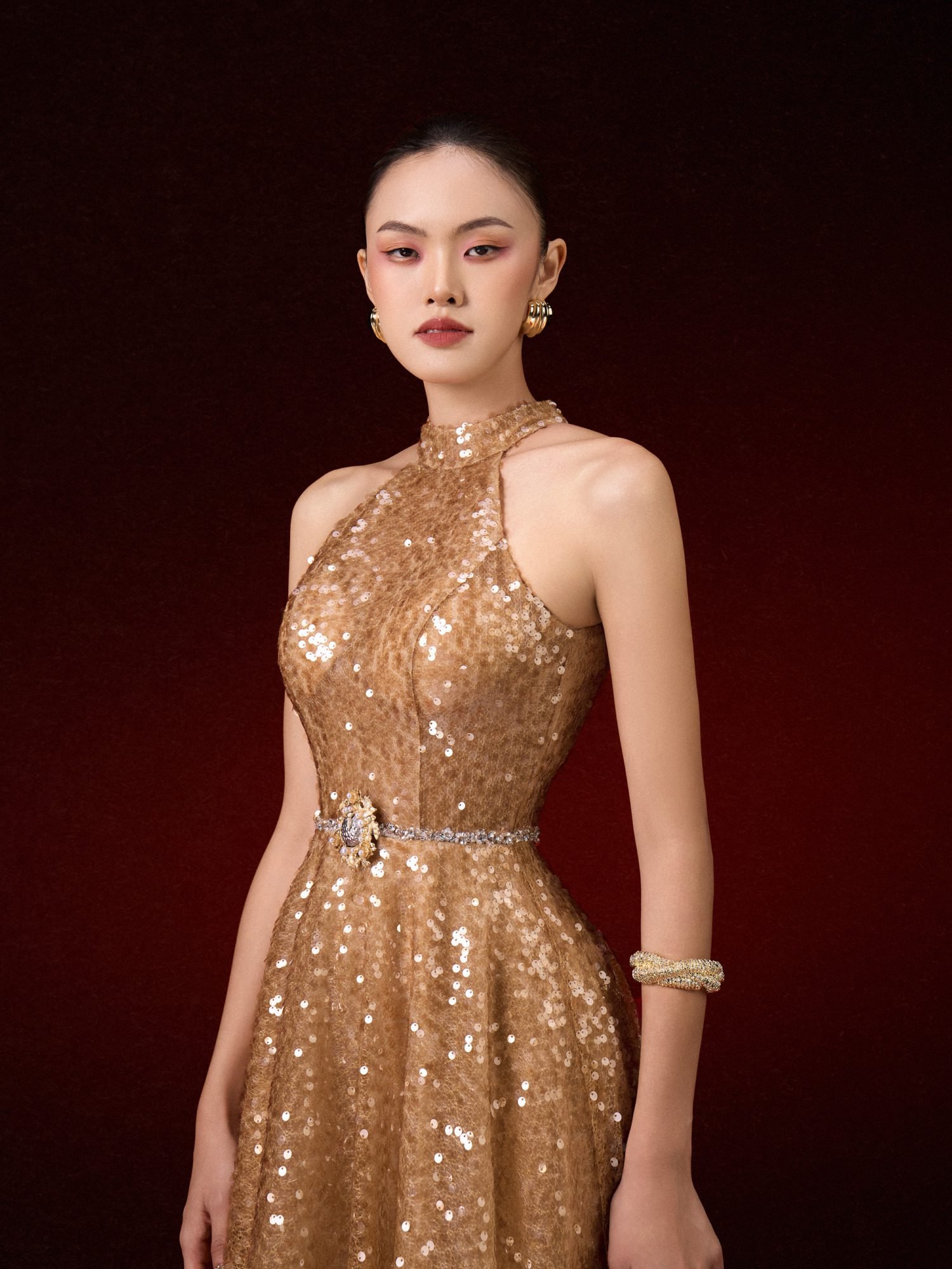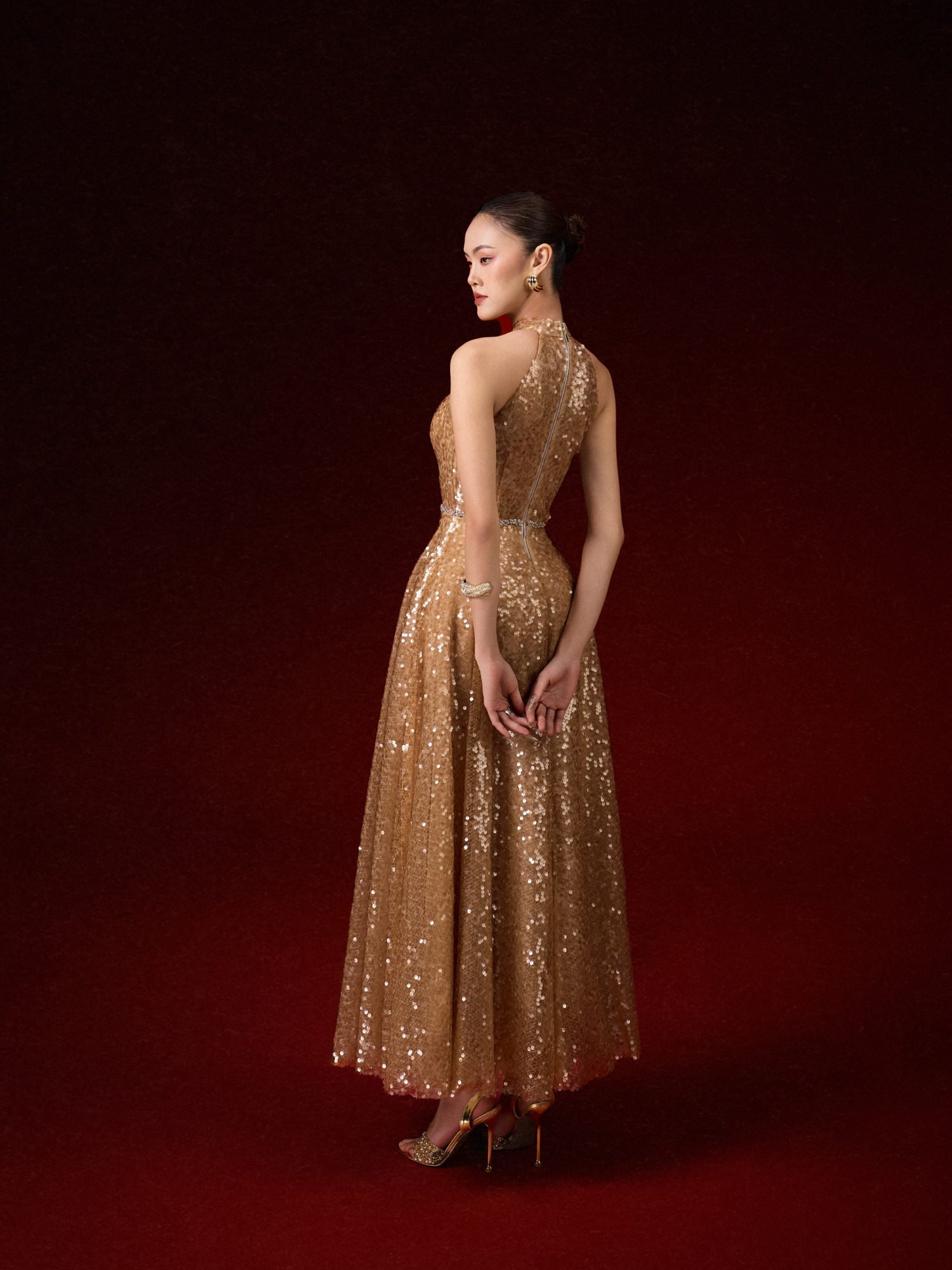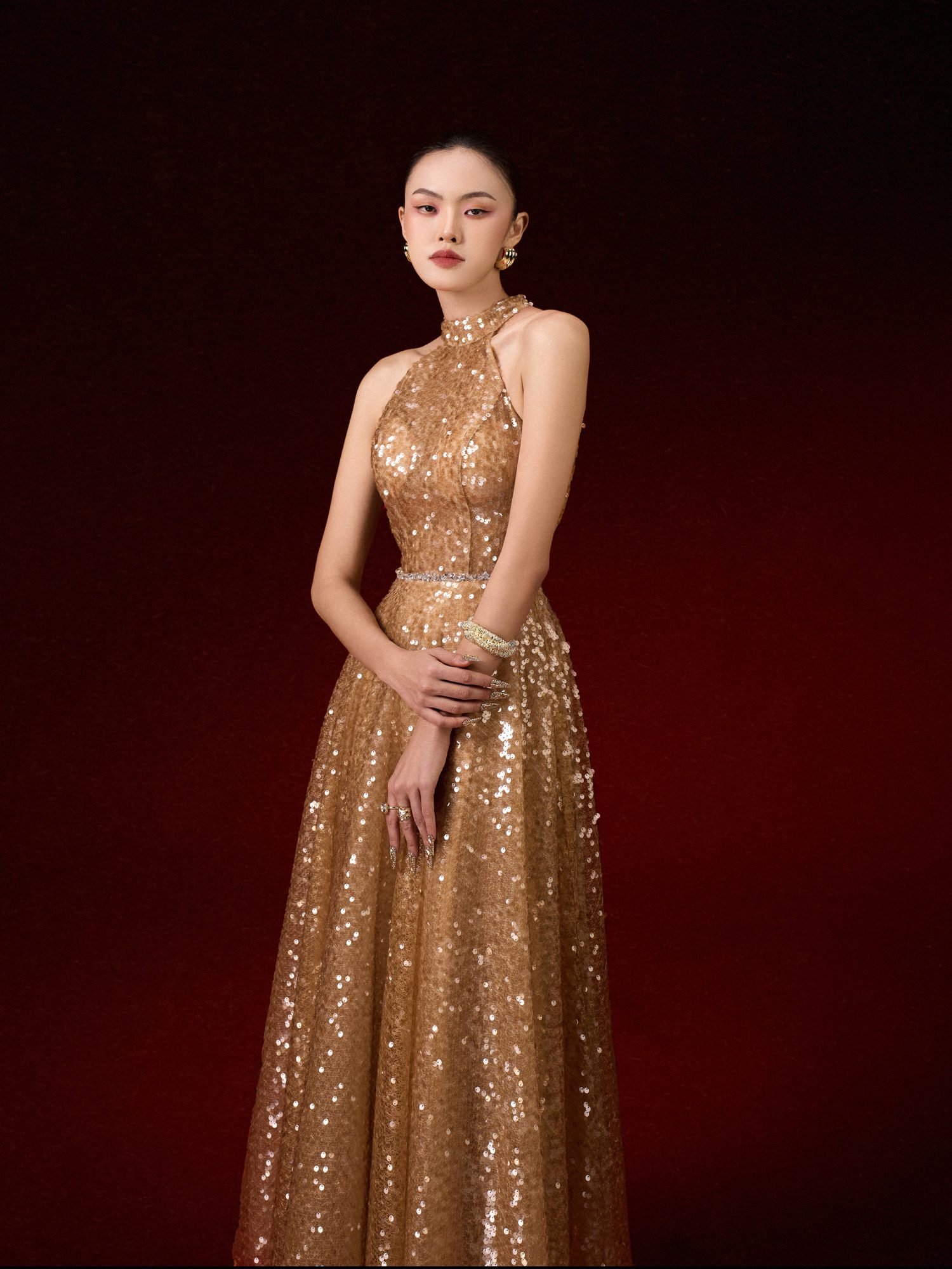 This dazzling gown exudes timeless glamour, crafted from luxurious sequined fabric that catches the light from every angle. The halter neck design adds a contemporary touch, framing the shoulders and neckline with grace. A delicate, jeweled belt cinches the waist, emphasizing the figure with a refined and elegant touch.