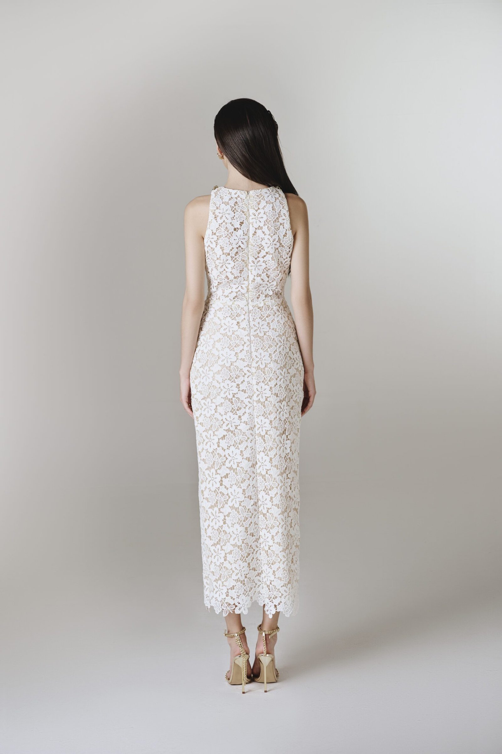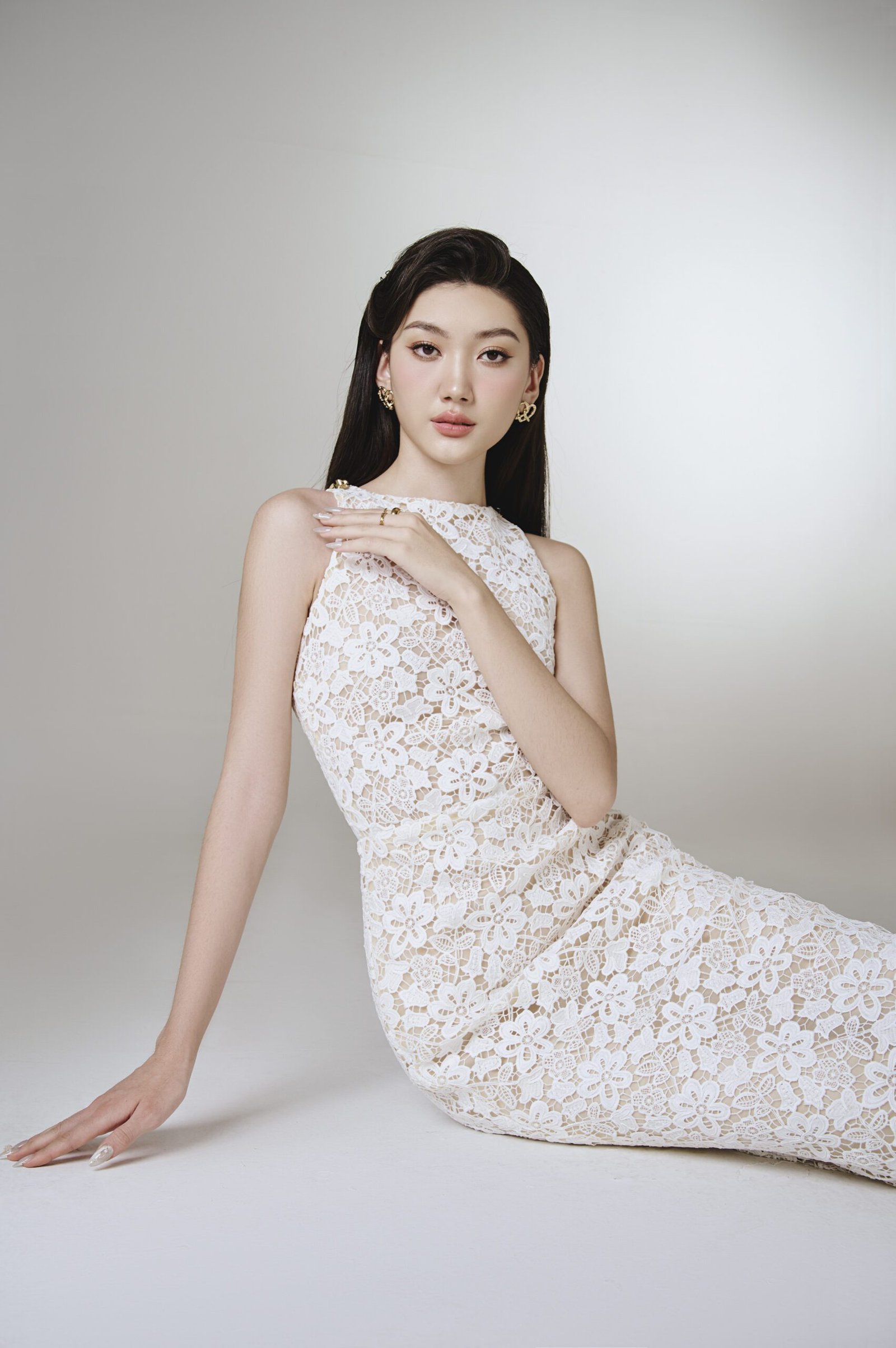 The Iris Dress epitomizes elegance and simplicity, making it a versatile choice for various occasions, from parties and work to casual outings. In a refined cream white, it combines lace mesh with silk lining, offering a sophisticated and comfortable wear.