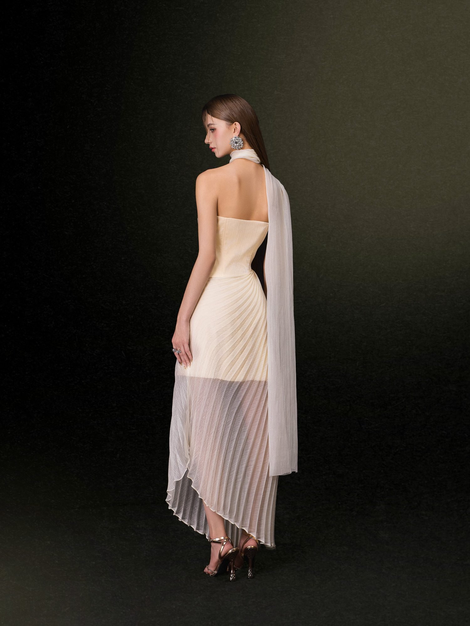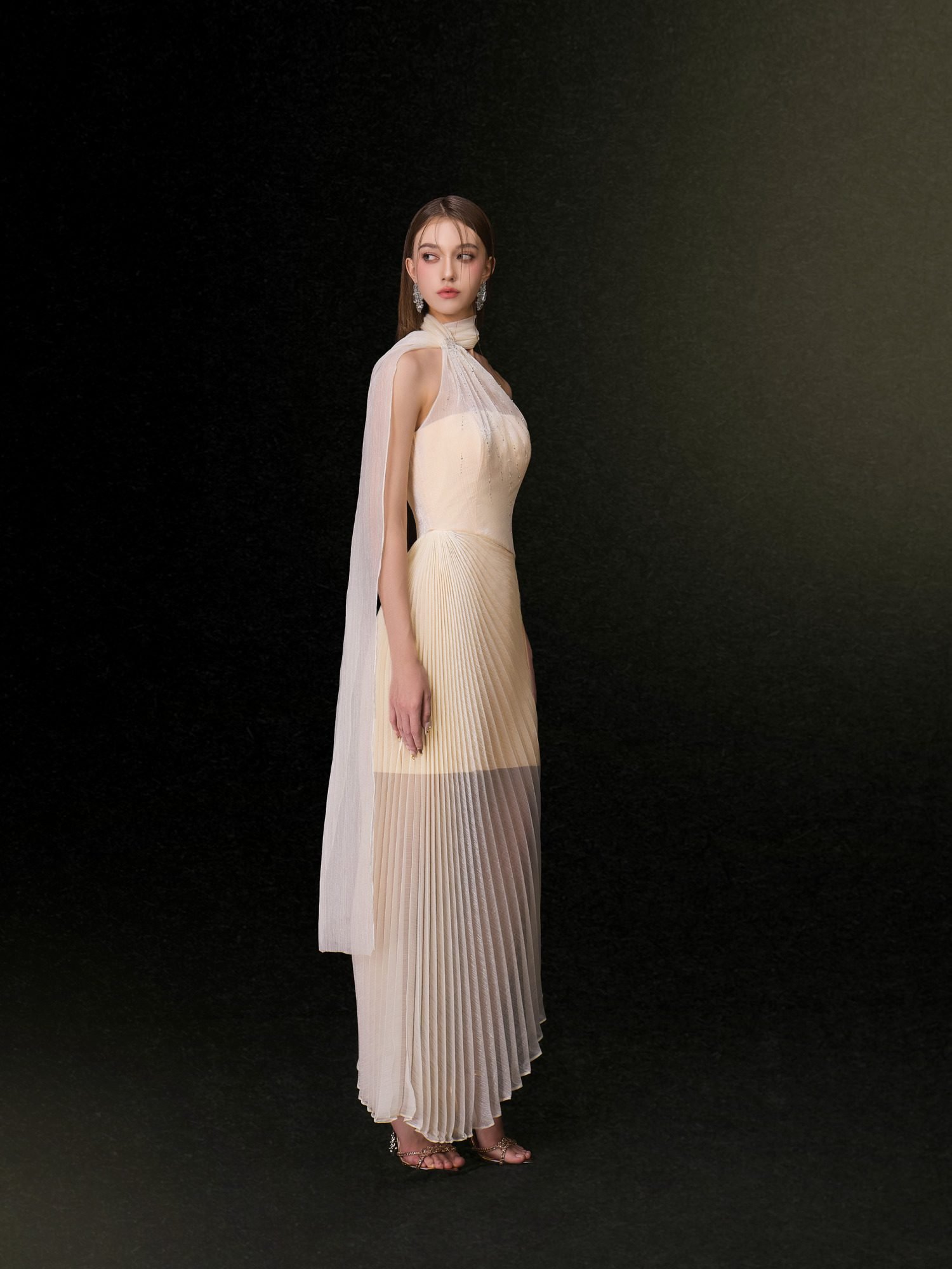 The dress features a halter-style neckline, where delicate sheer fabric cascades gracefully from one shoulder, creating a sense of flowing movement. The body of the gown is crafted from soft, pleated fabric that intricately wraps around the figure, gently hugging its contours. The asymmetrical hemline enhances the modernity of the design, while the gentle shimmer of the fabric gives it an ethereal quality.