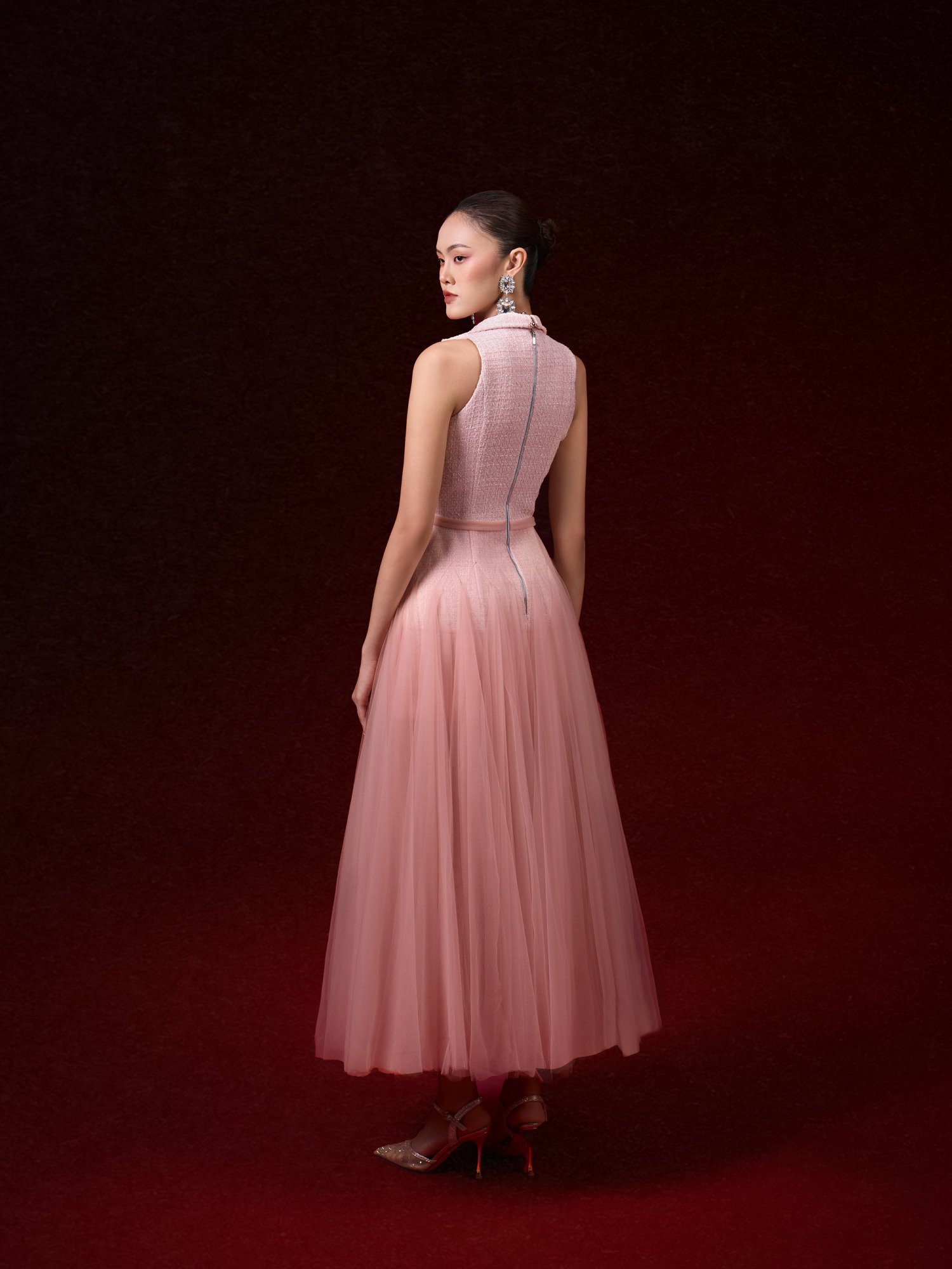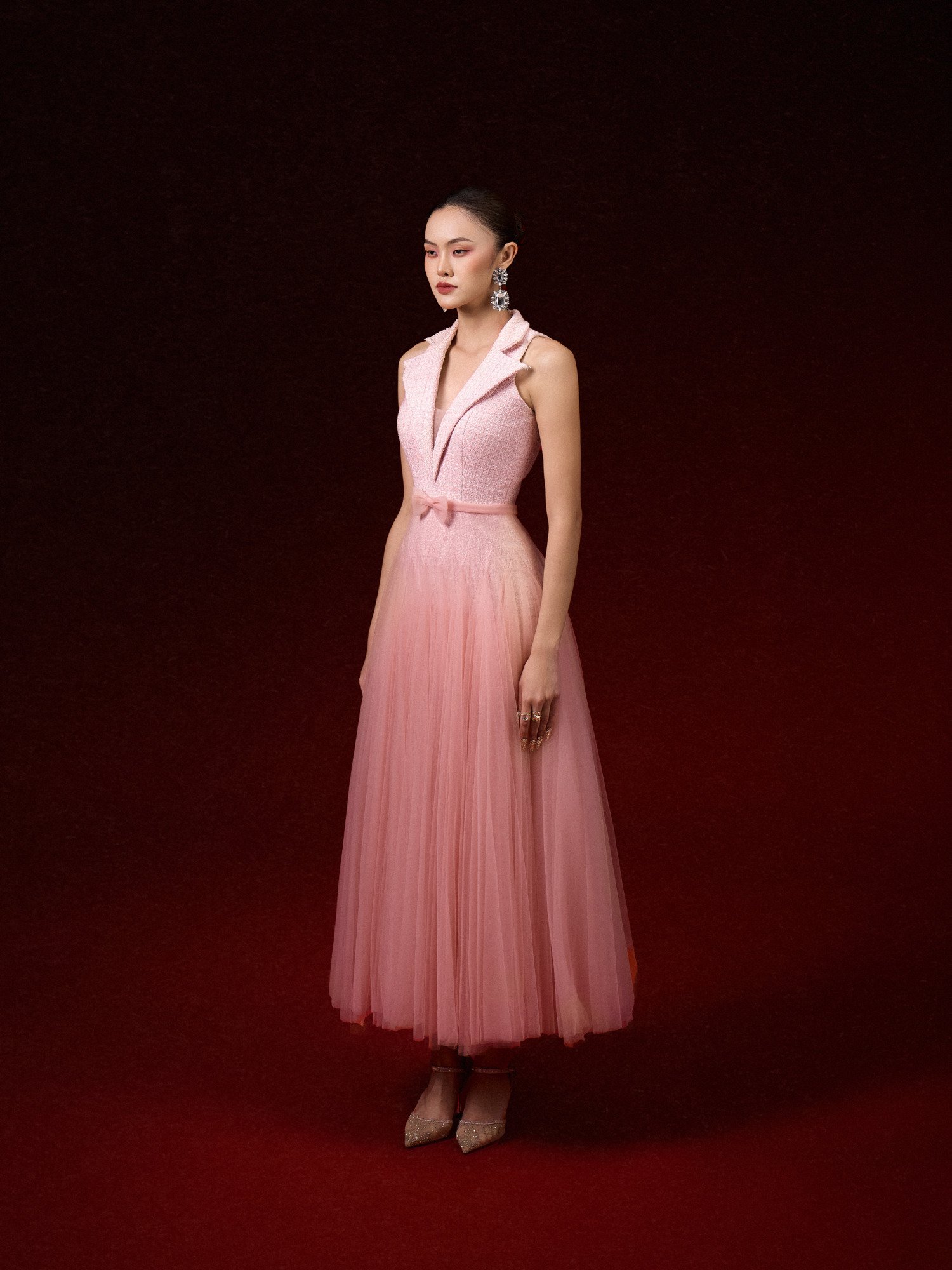 The soft blush pink hue enhances the feminine allure, while the fitted bodice, detailed with a delicate bow at the waist, creates a flattering silhouette. The collared neckline adds a refined, tailored element, giving the dress a modern, chic twist. The flowing skirt, made of light tulle, cascades effortlessly to the floor, creating a dreamy, ethereal effect.