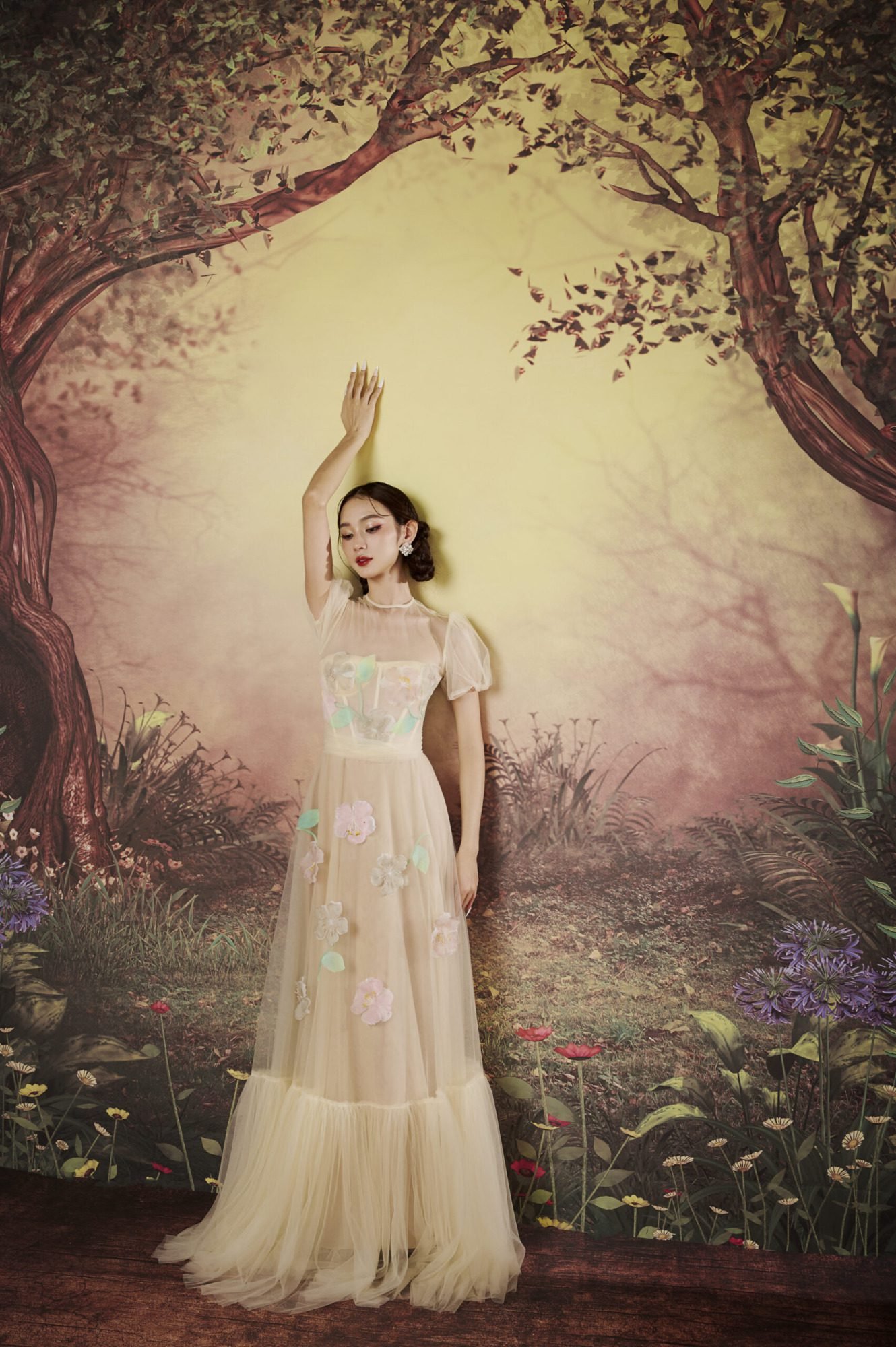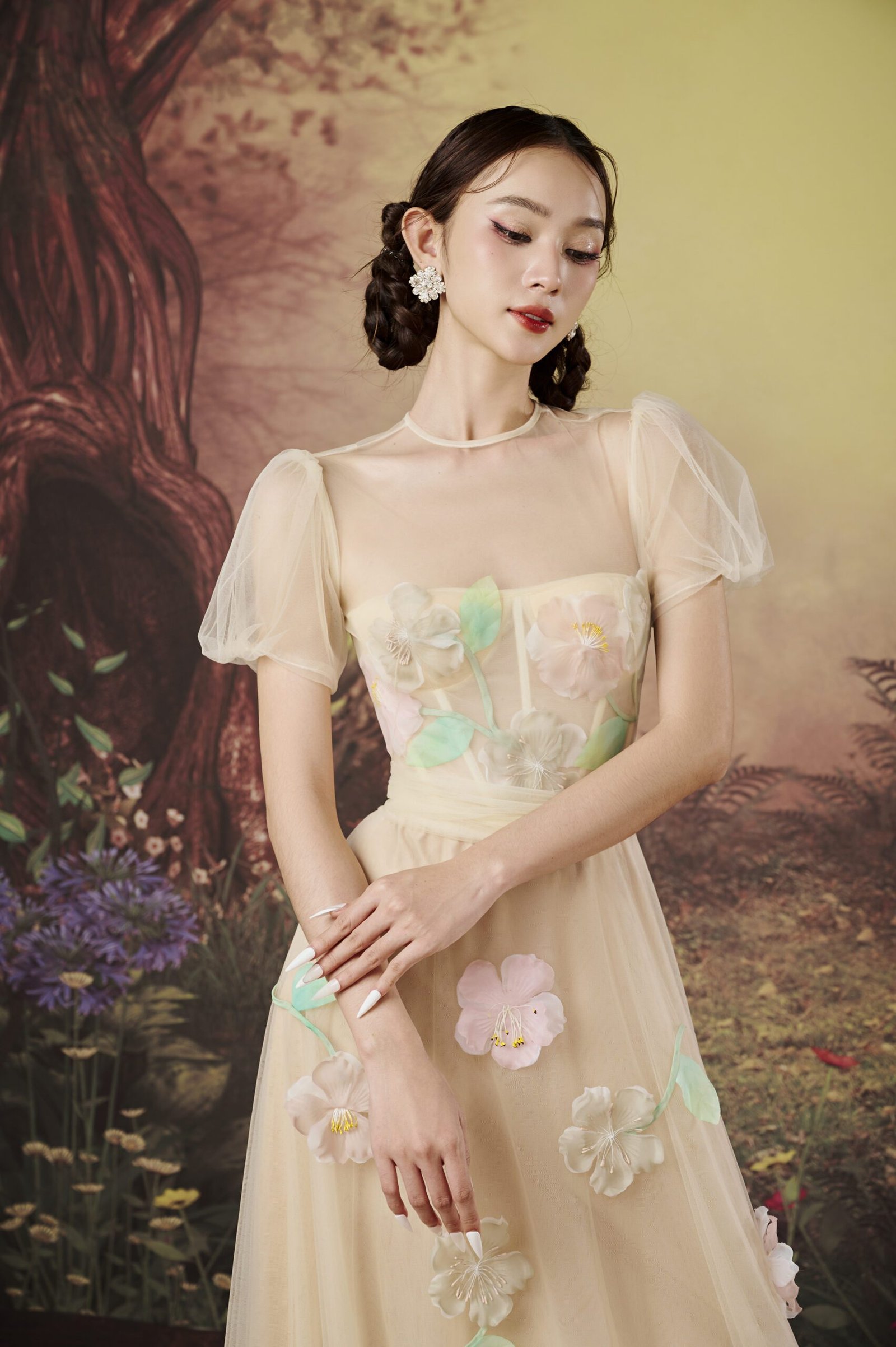 The Rosa Dress from the La Forêt de Joséphine collection embodies the essence of French fashion. Featuring a refined cream and crafted from soft mesh with luxurious silk lining, this gown stands out with its meticulously crafted floral appliqué and detailed embellishments. The natural beauty of these elements makes it a perfect choice for elegant and formal occasions.
